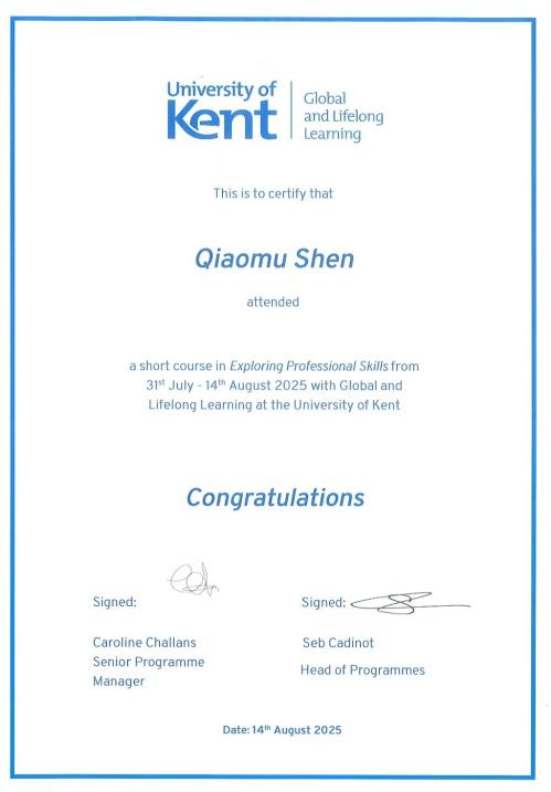 2025年7月30日至8月14日,我院SQA-AD项目24级学生沈橋牧参与了由中国留学服务中心与英国肯特大学联合举办的研学活动。此次活动为期两周,与沈橋牧同行的还有来自全国其他院校SQA项目的24名学生。