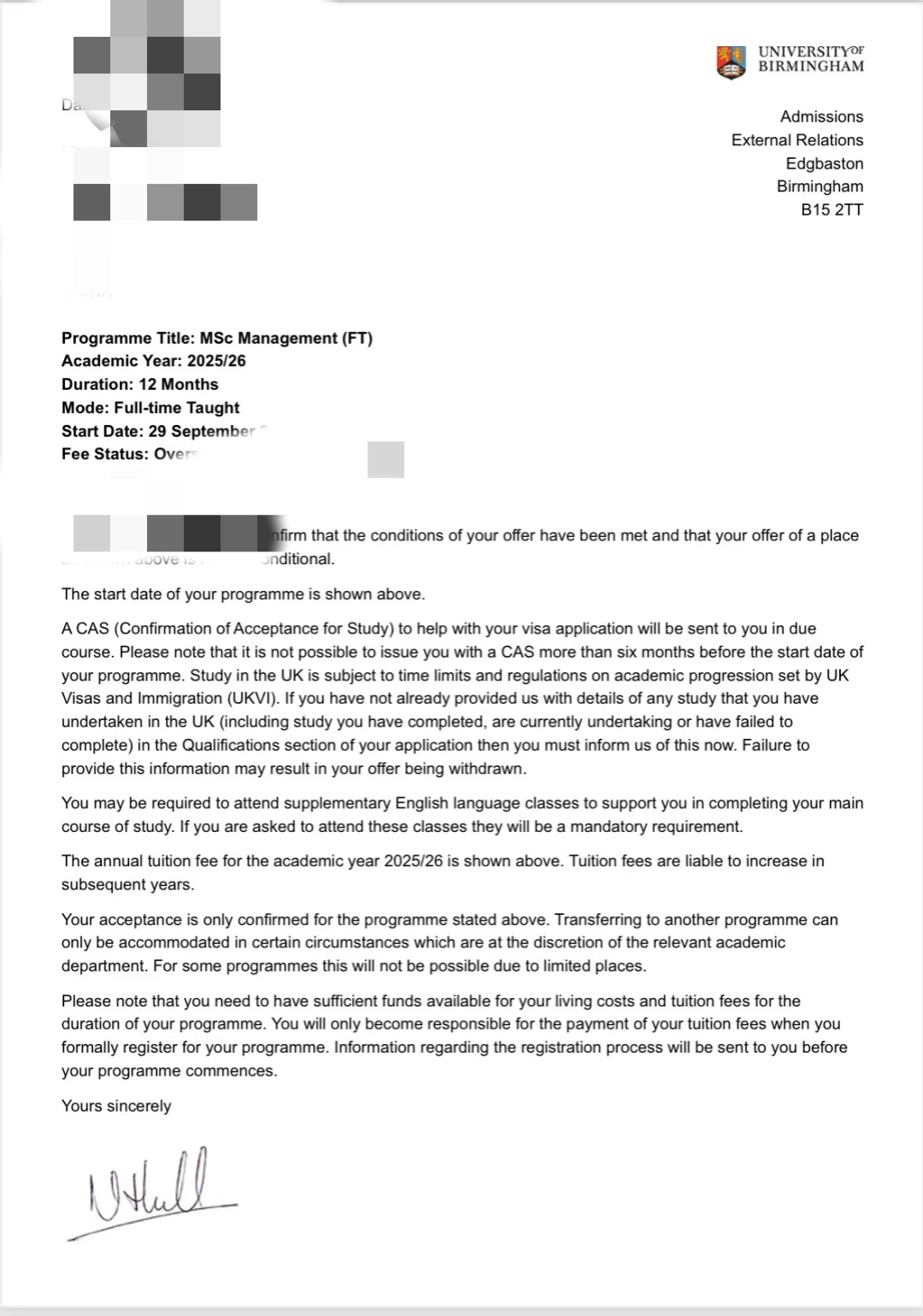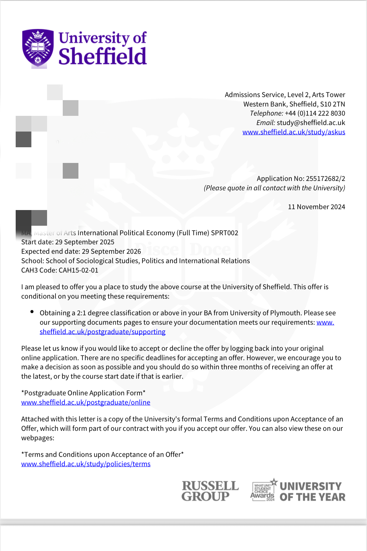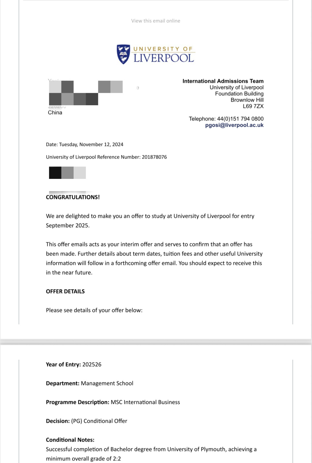 三年时光充实而珍贵。我由衷感谢所有教导过我的老师,他们不仅是知识的传递者,更是我留学路上的启蒙者和支持者。在我的努力学习下顺利拿到了英国伯明翰大学、布里斯托大学、谢菲尔德大学、利物浦大学以及纽卡斯尔大学的offer。同样感谢一路同行、彼此鼓励的同学们,让这段求学旅程温暖而明亮。