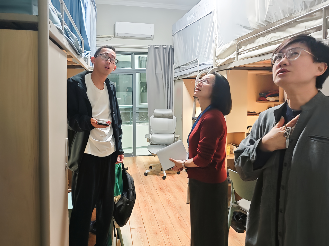 交流环节结束后,林燕老师、张雯飞老师一行随即走进虹口校区学生宿舍,将温暖直接送到同学们“家门口”。走访中,老师们不仅化身“生活管家”,细心查看宿舍环境与安全设施,排查各类小隐患,更与大家围坐一起,像家人般聊起近况,从“食堂饭菜合不合口味”到“近期考试压力大不大”,关怀细致入微。老师们还分享了实用的时间管理“小妙招”与生活技巧,让学院的暖心关怀,真正成为同学们身边可感、可用的贴心支持。