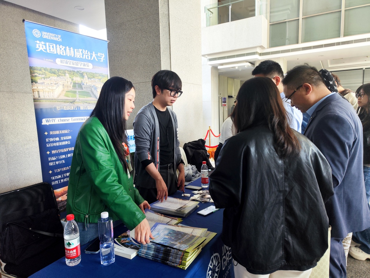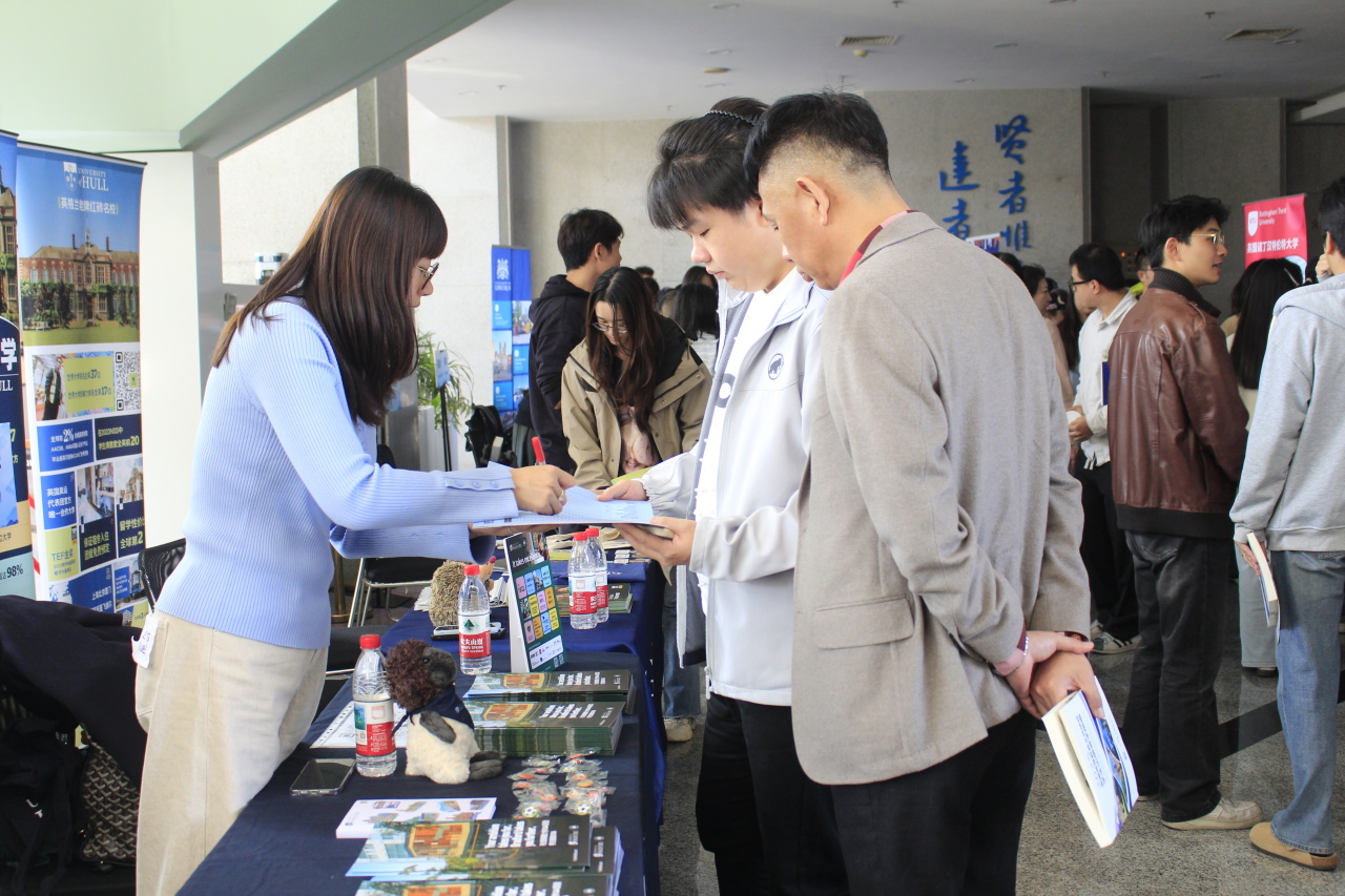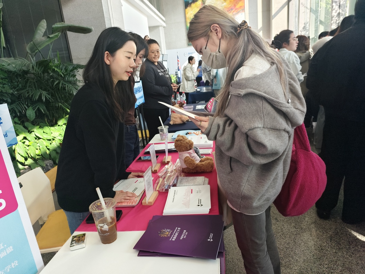 讲座结束后,学生与家长移步至行政楼大厅,参加英国高等教育文凭项目高校交流会。现场气氛热烈,33所海外院校的校方代表齐聚一堂,为学生及家长提供一对一的咨询与指导。值得一提的是,本次活动不仅面向23级学生,也有序组织24级学生分批次参与,旨在让同学们提前了解海外院校的专业设置、学业要求等,科学做好学业规划,为未来留学之路奠定坚实基础。