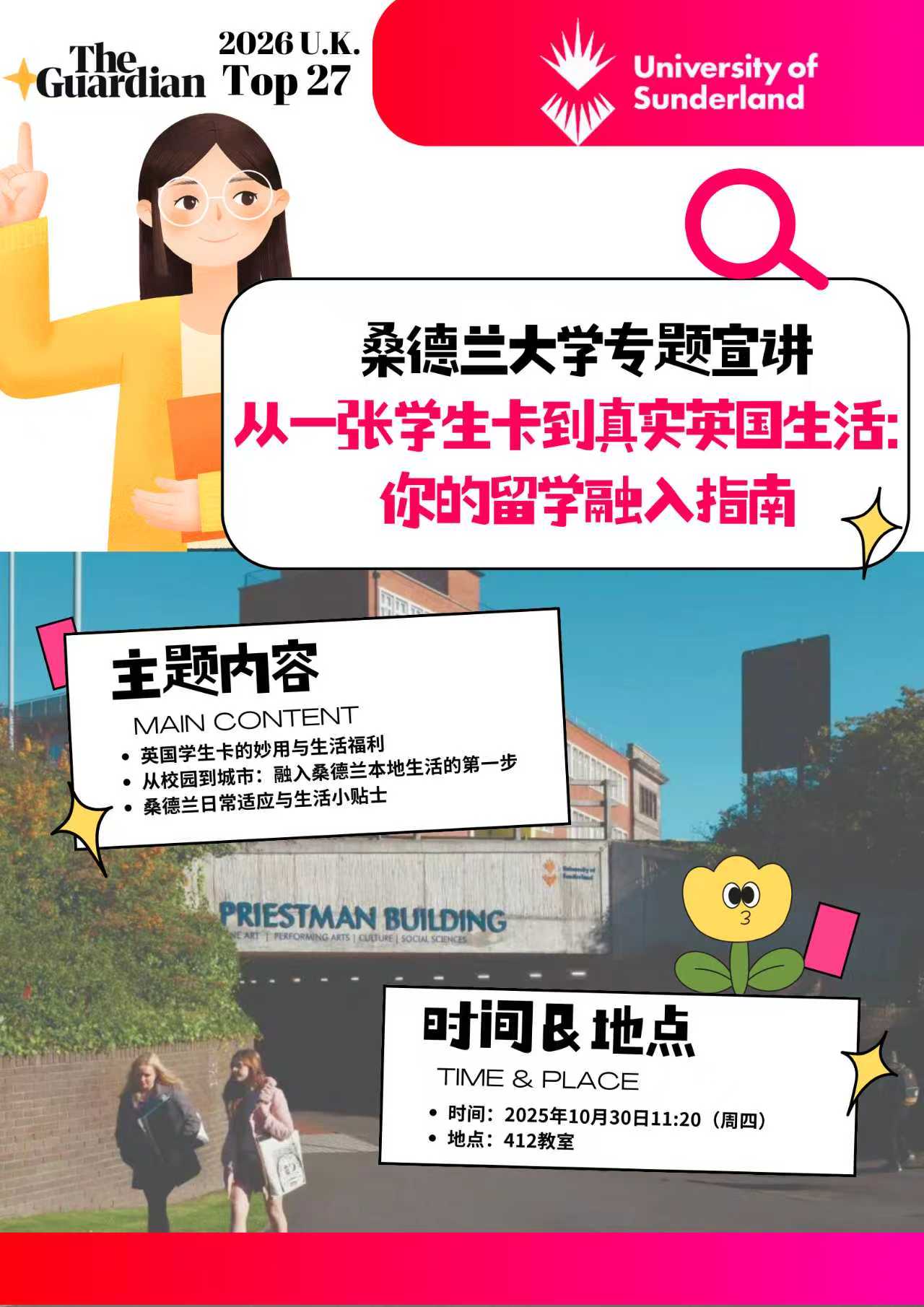10月30日中午,英国桑德兰大学招生官王老师为我校国际教育学院AD项目的学生带来了一场内容丰富的留学主题分享会。