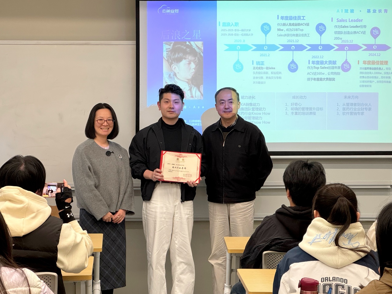 活动伊始,院长助理叶欣博士为孙学长颁发聘书,聘请其担任学院“校外行业导师”。这一仪式不仅标志着校友育人平台的进一步深化,更体现了学院“以校友带校友”的传承理念。作为从贤达走向职场的优秀代表,孙学长以其积淀的职场智慧与实践经验,为在校学子搭建起一座连接理论与现实、校园与职场的桥梁。