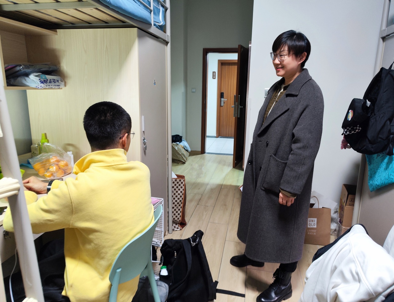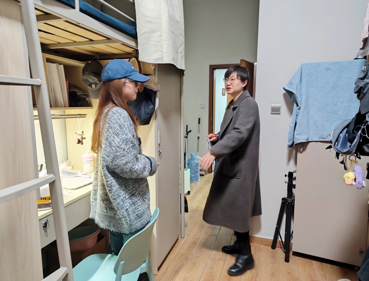 当日,学院教师一行还深入学生宿舍开展走访,实地了解同学们的住宿与日常生活情况。正值秋冬交替之际,老师们重点查看了宿舍用电安全及消防通道畅通等情况,提醒同学们注意冬季防火、防滑、防寒等安全事项。同时,老师们与学生亲切交谈,关心大家的课余安排与身心状态,鼓励合理规划作息,在专注学业的同时注重健康与安全。此次走访不仅拉近了师生距离,也让学生感受到学院细致入微的陪伴与支持。