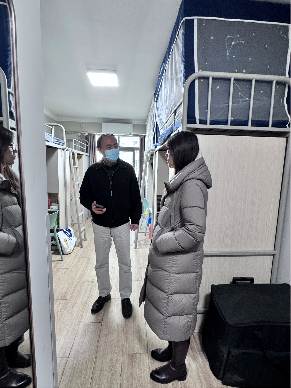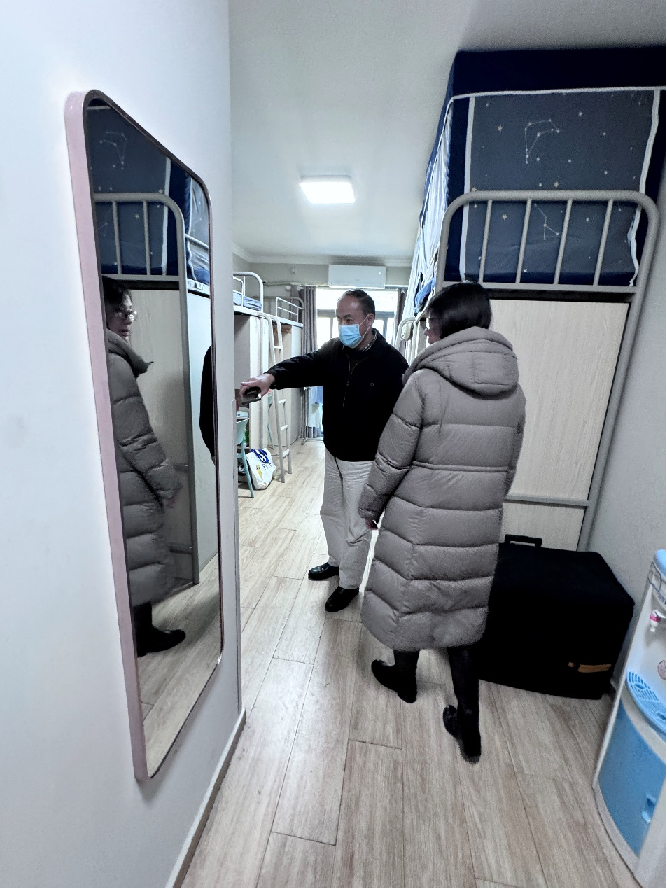 会后,叶老师和李华老师还突击检查了多个学生宿舍,特别关注了宿舍内的电器使用情况、是否有烟味、酒味等异味,以及宿舍物品摆放尤其是杂物和清洁卫生的情况。通过检查发现,这些宿舍都基本整洁有序,无违规电器使用情况,且无异味,这反映出同学们对自身能做到较高的要求,也反映了平时宿舍管理工作的及时到位。