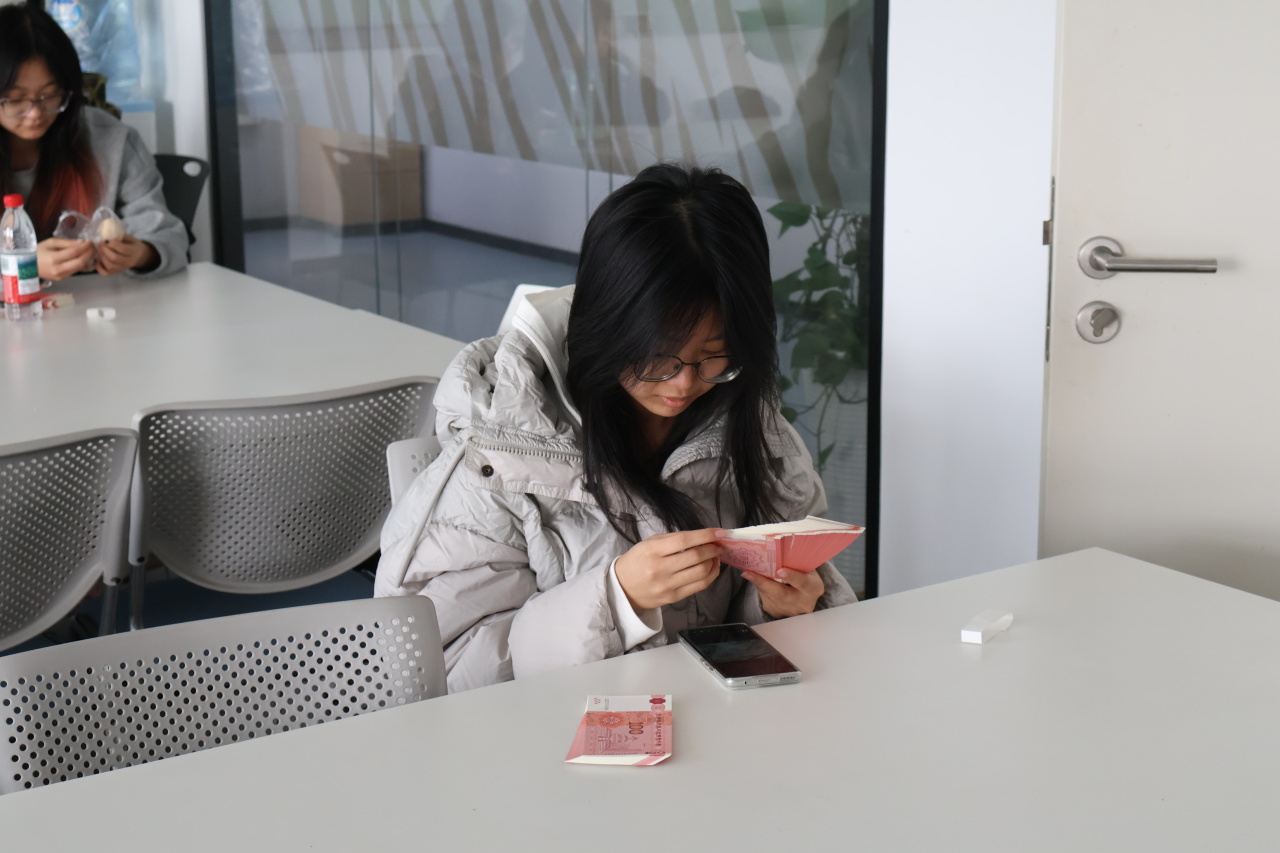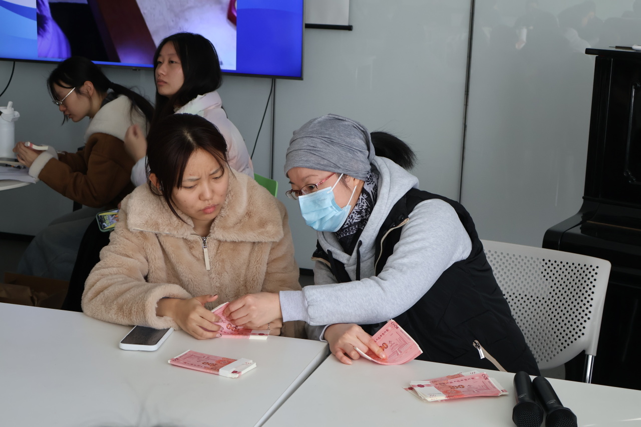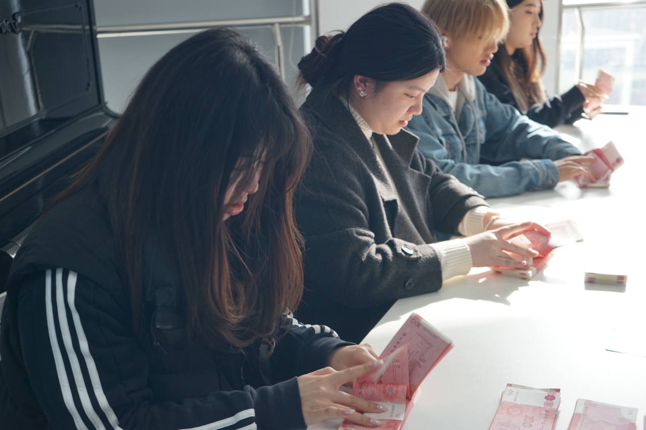 上午的点钞工作坊中,师生聚焦单指单张、扇面式、四指四张、多指多张四种银行核心点钞技法,三位指导老师分组开展一对一指导,从握持手势到提速窍门倾囊相授,同学们以练功券为载体深耕细练,在两小时内实现手法规范与精准度的双重提升。