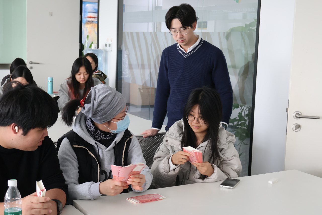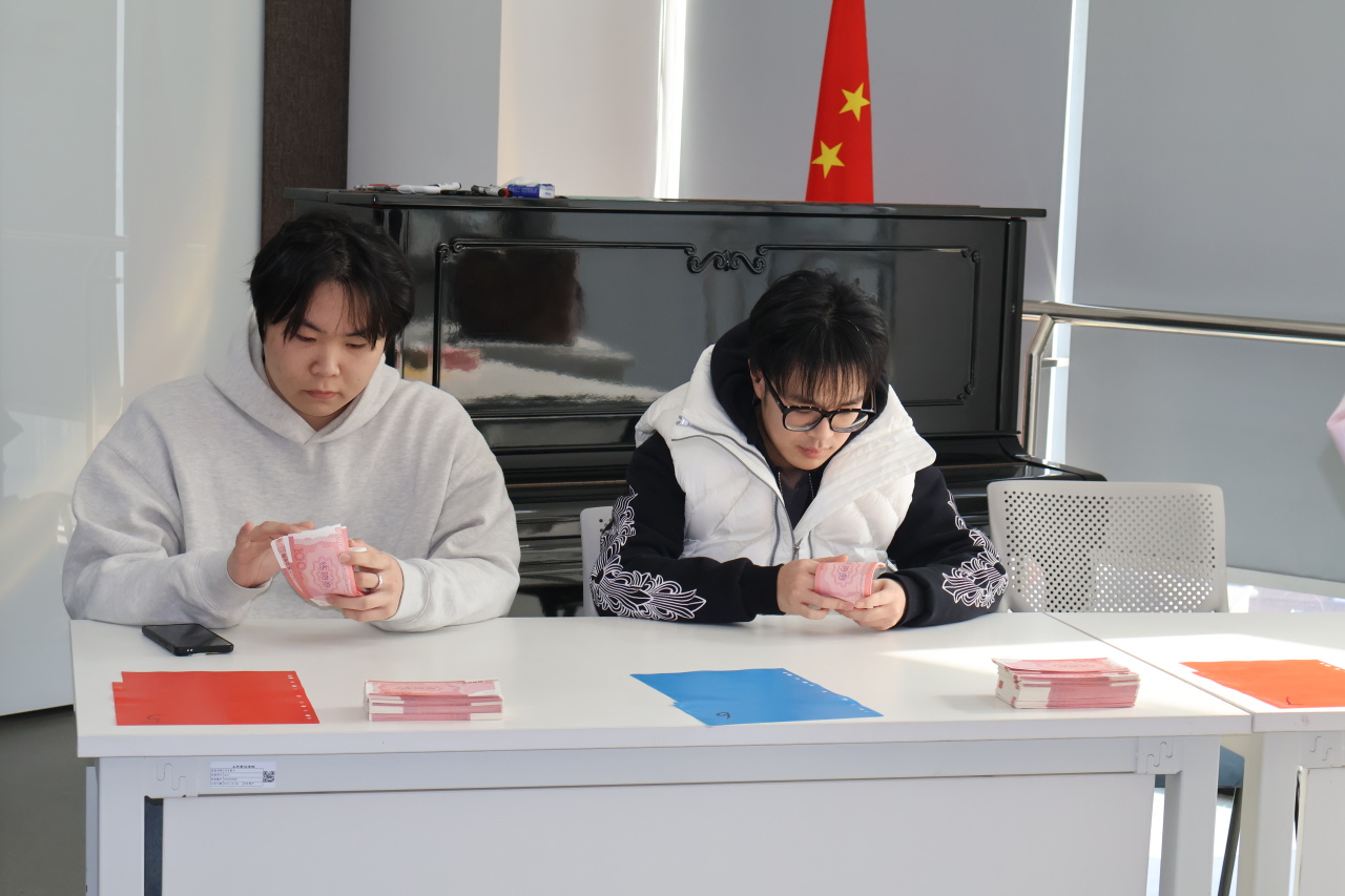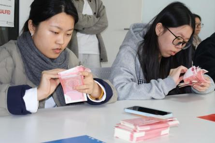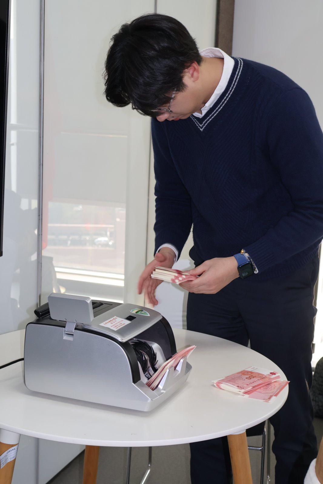 上午的点钞工作坊中,师生聚焦单指单张、扇面式、四指四张、多指多张四种银行核心点钞技法,三位指导老师分组开展一对一指导,从握持手势到提速窍门倾囊相授,同学们以练功券为载体深耕细练,在两小时内实现手法规范与精准度的双重提升。