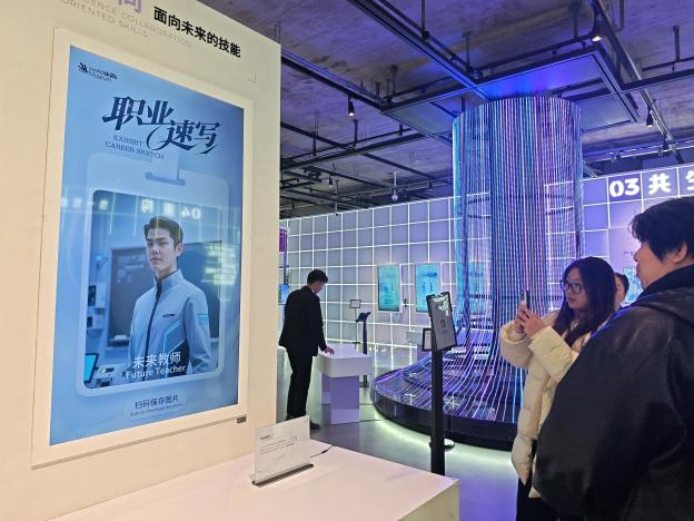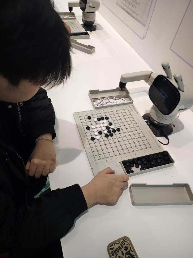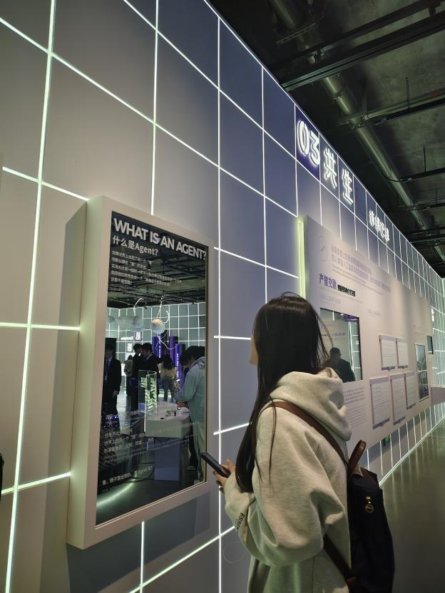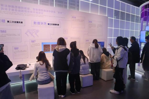 在人工智能主题区,同学们通过“音浪织光”、机器人对弈等互动展项,亲身体验前沿技术对生活的改变。这些可感可触的设计引导同学们深入思考科技向善的路径、青年所需技能等问题,并围绕短视频创作,探讨如何通过镜头表达对技术伦理、个人价值与社会发展的思考。