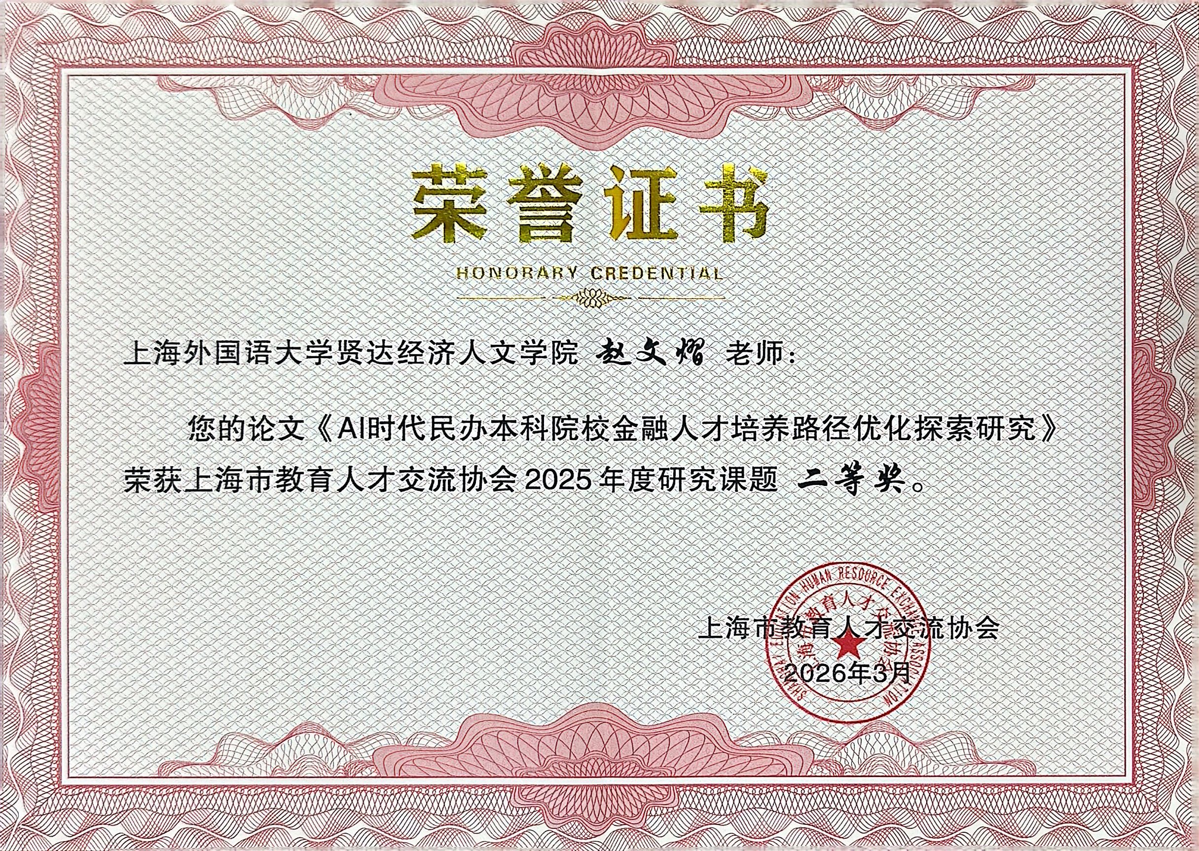 喜报 | 我院赵文熠老师论文荣获上海市教育人才交流协会2025年度研究课题二等奖