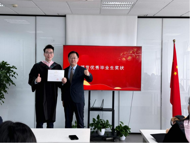 随后,院长助理李强为2024级优秀毕业生代表林驰博颁发奖状,表彰其在学业成绩、社会实践等方面的突出表现,为全体同学树立了榜样。
