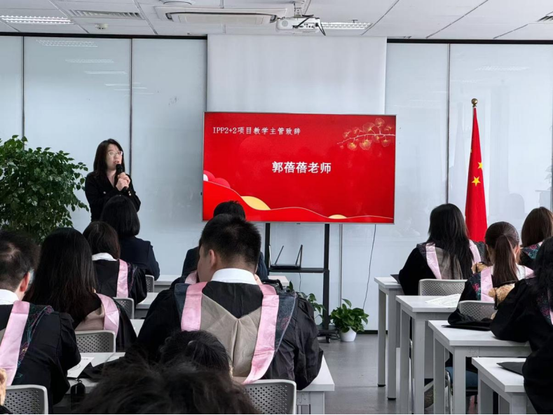 在全场热烈的掌声中,典礼进入颁发结业证书与优秀学生表彰环节。林燕老师为2024级IPP 2+2项目同学逐一颁发结业证书,证书上凝结着同学们两年的努力与汗水,也承载着母校的祝福与期许。