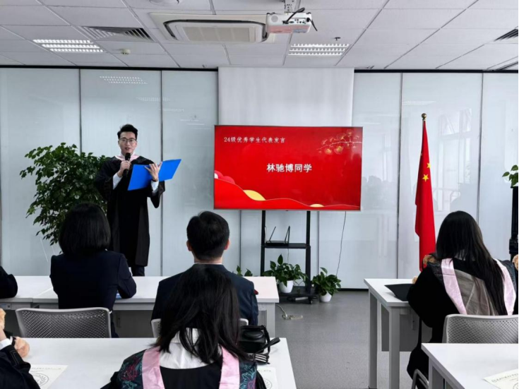 优秀毕业生代表林驰博同学在发言中,向悉心培育的老师们致以最诚挚的感谢,向一路相伴的同学们表达深厚情谊。他分享了即将赴海外合作院校深造的规划,立志在海外两年中全力以赴,以优异成绩回报师长的厚望与学院的培养,用实际行动践行“贤达学子,世界舞台”的誓言。